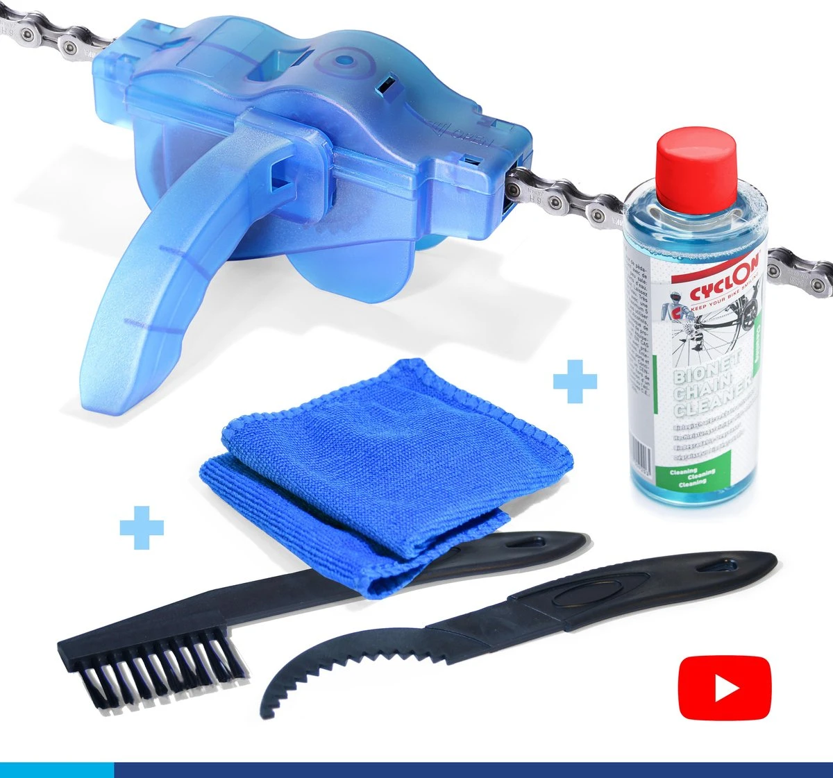 Spoel je fiets af, gebruik geen hogedrukreiniger. Met de borstels verwijder je stukjes vuil en zand tussen de cassette en tandwielen. Vul de ketting reiniger met ketting ontvetter. Klik de ketting reiniger op de ketting en maak minimaal 30 rotaties zodat de ketting goed wordt ontvet. Spoel de reiniger schoon en vul deze met water en zeep. Herhaal deze stappen voor een goede schoonmaakbeurt. Met de microvezel doek droog je de ketting af en verwijder je overtollige olie. Nadien smeer je de ketting in.