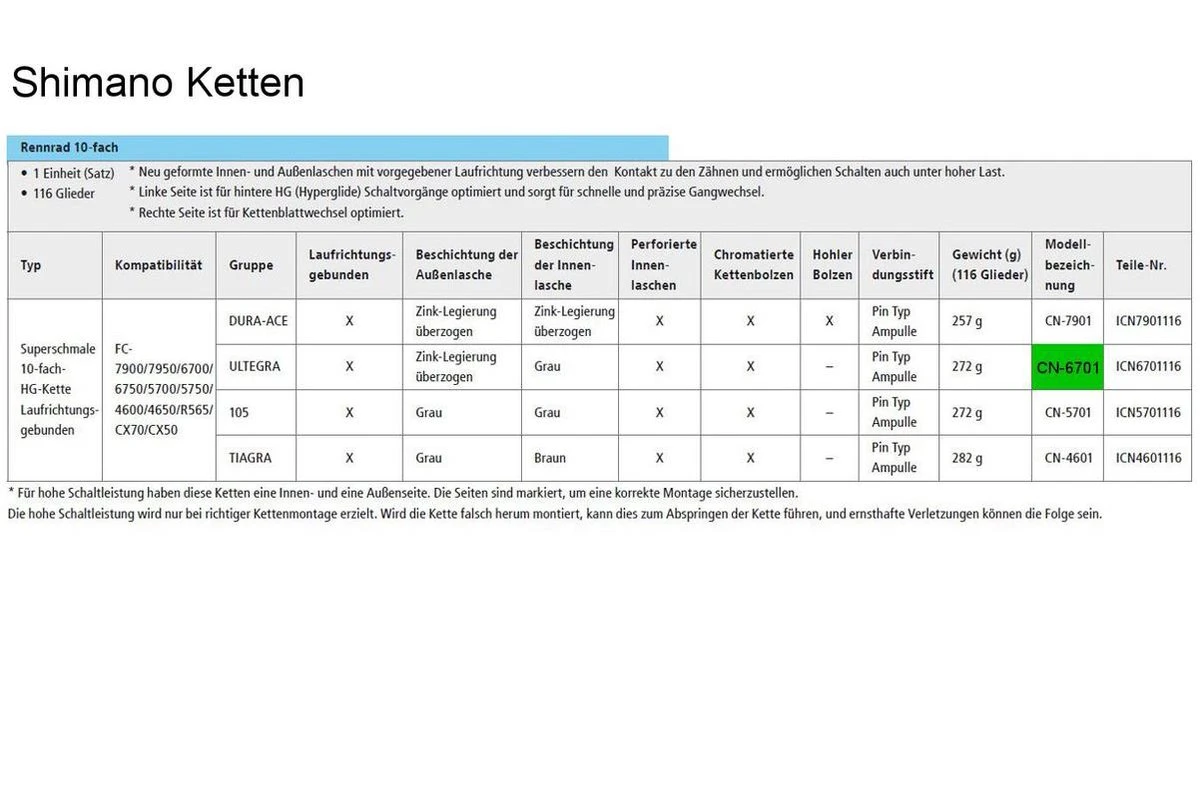Product specificaties Shimano groep: Dura-Ace / Ultegra / 105 Merk: Shimano Modelnaam: CN6701 Modeljaar: 2010 Aantal versnellingen: 10 Aantal schakels: 116 Soort artikel: Ketting