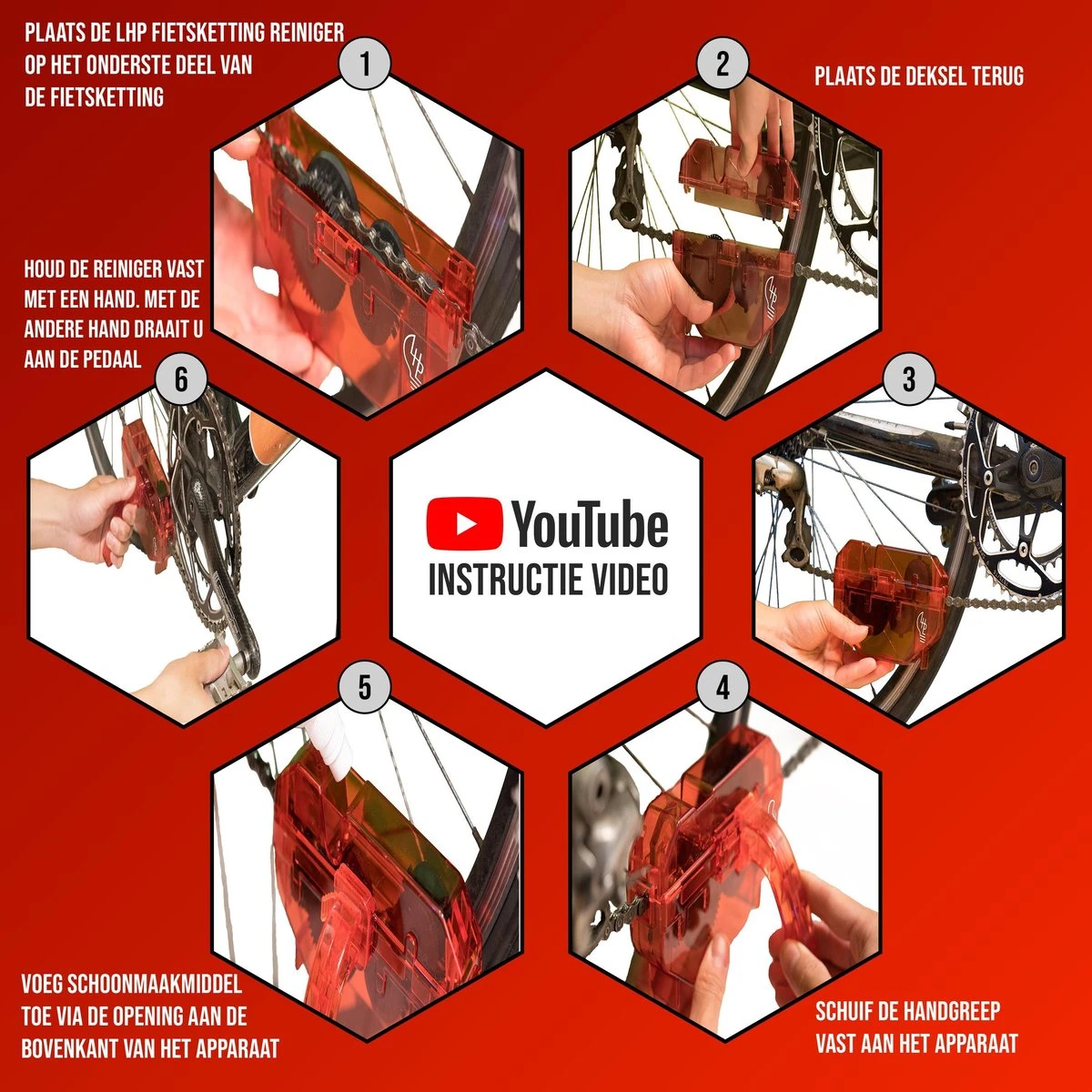 De LHP fietsketting reiniger maakt de fietsketting op een handige manier schoon, zonder de ketting van de fiets te demonteren. De reiniger heeft een aantal roterende borsteltjes om de ketting grondig schoon te maken. Niet alleen aan de buitenkant, maar ook tussen de schakels in. Daarnaast heeft het apparaat een groot reservoir voor schoonmaakmiddelen. Een fietsketting die niet schoon wordt gemaakt, gaat na enige tijd roesten. Hierdoor is het schoonmaken en onderhouden van de fietsketting essentieel. Vooral wanneer je een open kettingkast hebt. Door een schone fietsketting verleng je de levensduur van de ketting en de tandwielen van de fiets. Ook zal het versnellingssysteem nauwkeurig schakelen.