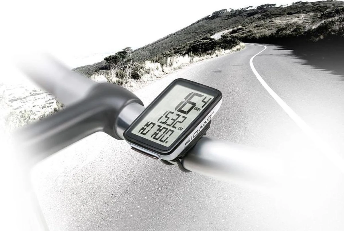 De Sigma Pure 1 fietscomputer met draad heeft 5 functies en een groot display.